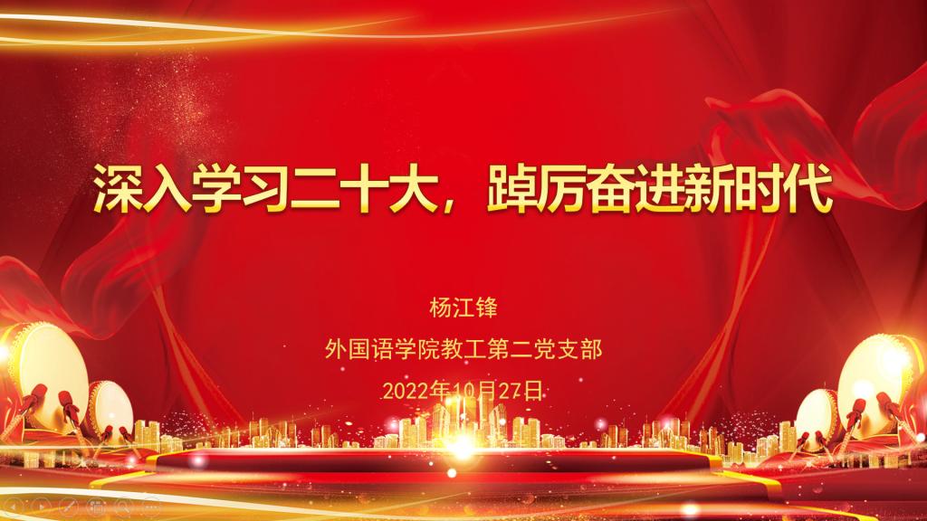 为深入学习党的二十大报告,深刻理解二十大精神,正规滚球app平台官网党总支10月27日组织三个党支部共同上党课《深入学习二十大,踔厉奋进新时代》,由正规滚球app平台官网教工第二党支部书记杨江锋主讲。