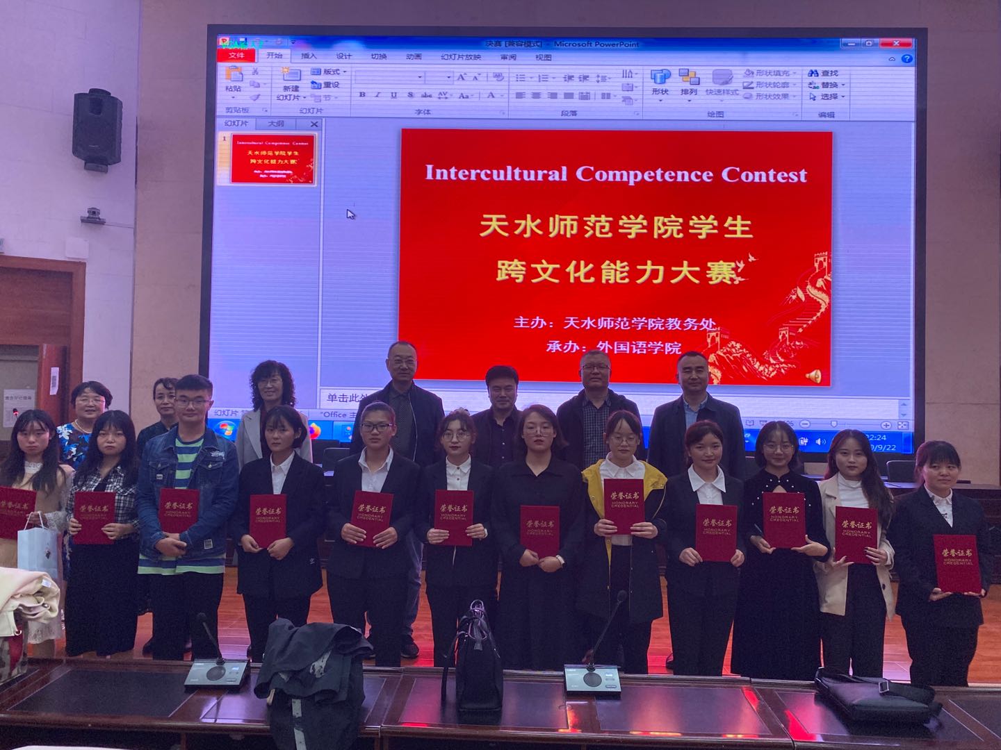 9月22号晚7:30,由教务处主办,正规滚球app平台官网承办的天水师范学院学生跨文化能力大赛在2号报告厅隆重举行,教务处处长郭昭第应邀出席本次大赛。大赛评委由正规滚球app平台官网院长姜炳生,副院长马金海、杨江锋,以及张亚兰、柳淑瑛、郭晓英、王海平老师担任。