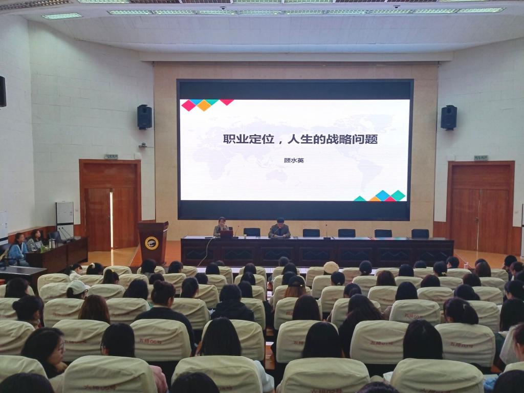 11月16日下午,正规滚球app平台官网特邀BCC国际生涯教练,高考志愿高级规划师(AUP),高校生涯课程导师,省级创业导师,国家一级职业指导师顾水英老师在2号报告厅作了题为“职业定位,人生的战略问题”的职业生涯规划辅导报告,外语学院领导班子部分成员、辅导员、班主任及2018、2019级本科生现场聆听此次报告。