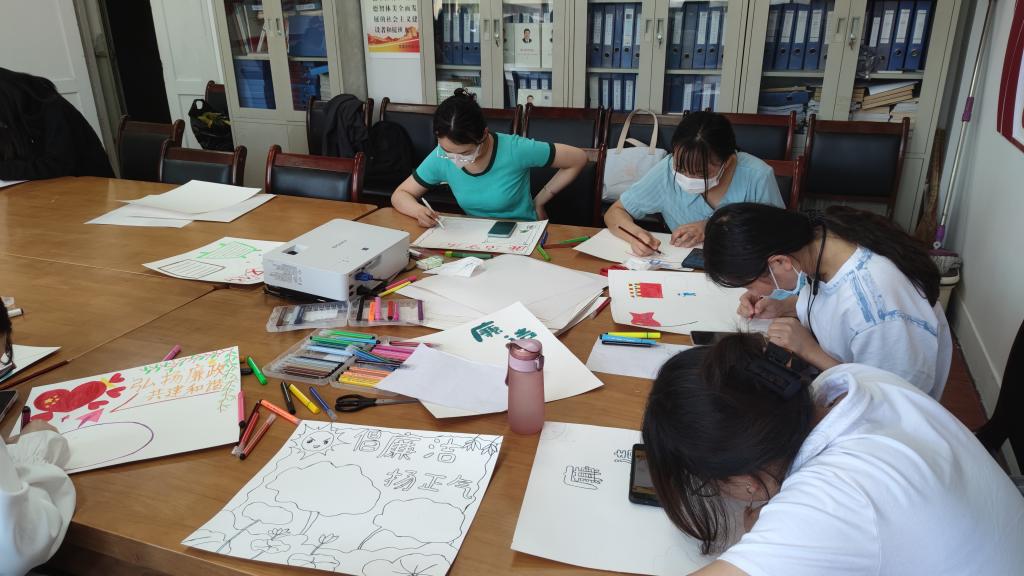 活动中,党员同志们一起现场裁剪纸张,分发绘画工具,根据党风廉政建设的内容,汲取中华民族传统文化中关于政德建设的思想精髓,充分利用所学知识和互联网络,边讨论边手绘。