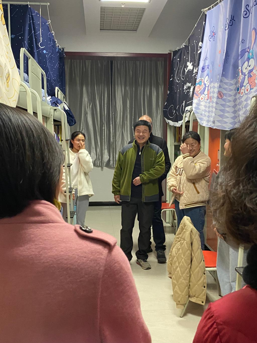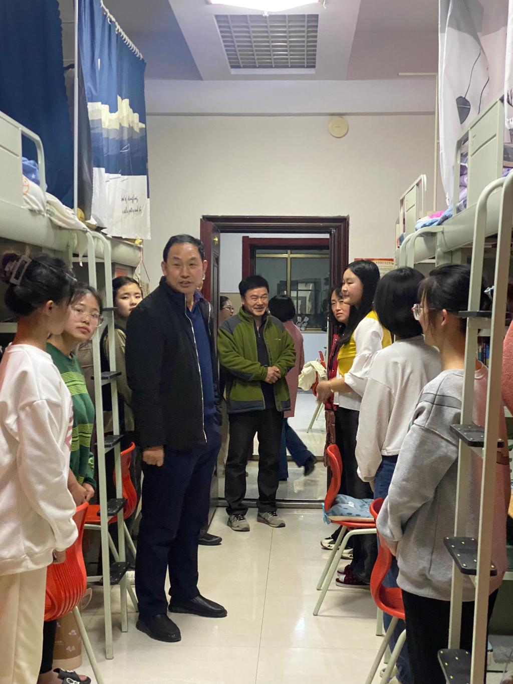 每到一个寝室,同学们都起身问好,欢迎老师们的到来。老师们和蔼可亲,询问同学们的家乡在哪儿,来到学校是否适应,在伙食、气候、住宿等方面是否习惯。宿舍暖气充足,有的同学穿得较少,老师们也提醒大家出去要穿暖,离家在外一定照顾好自己。