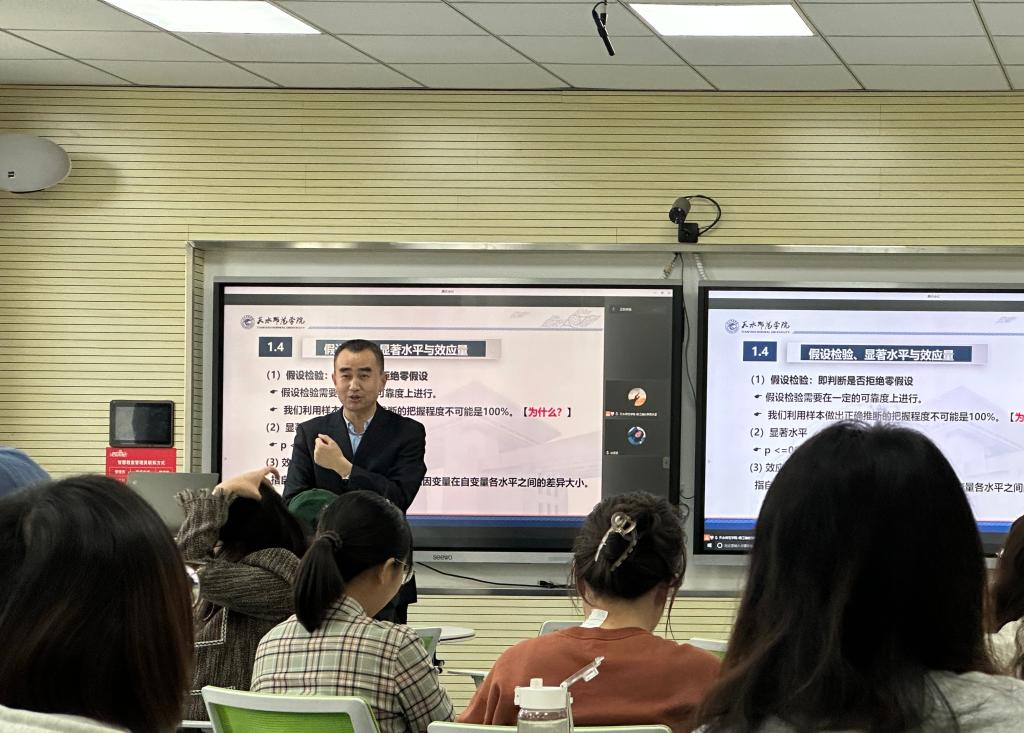 讲座上,杨老师讲述了自身的两段经历,以此告诉同学们掌握数据统计方法的重要性。接着,杨老师向同学们介绍了统计学中的重点概念:总体、样本、抽样与抽样误差;描述性统计和判断性统计;研究问题与假设;假设检验、显著水平与效应量;以及变量类型及其关系。关于统计方法概述,杨老师讲解了寻找差异的统计方法和寻找关联的统计方法,并实例展示了如何应用SPSS软件进行数据编码输入和统计处理,生动直观地呈现了整个数据处理的过程。