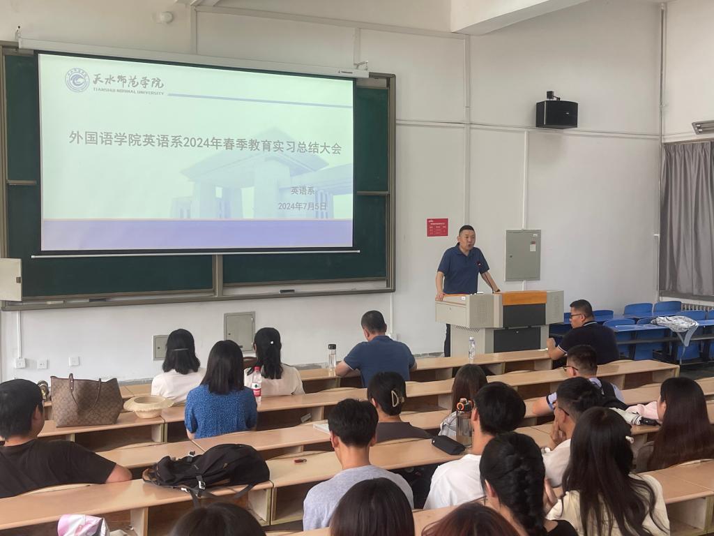 正规滚球app平台官网院长杨江锋、副院长张晖、英语系负责人、2021级班主任以及2021级英语专业全体学生参加了此次会议。在总结大会上,张晖副院长对滚球app官网春季教育实习的情况进行了简单的总结,向圆满完成实习任务、平安归来的同学们表示由衷的祝贺。随后,王楠、李嘉欣、库盼盼、余文静等9位同学代表奔赴新疆维吾尔自治区昌吉回族自治州、甘肃省临夏回族自治州以及在天水市和陇南市实习的63名实习生汇报了各自实习的开展情况,分享了实习感悟、总结了实习过程中的得失与收获。汇报完毕后,杨江锋院长发表了热情洋溢的讲话。杨院长用“反差”和“收获”两个关键词总结了同学们的教育实习。杨院长表示,通过此次教育实习,他看到了同学们的成长,感受到了同学们在教育实习后所散发出的自信。杨院长勉励同学们在今后的学习和生活中,能够继续保持这种自信,发扬斗志昂扬的精神。同时,杨院长也希望即将参加秋季教育实习的同学们能从本次总结大会中汲取力量,提前为自己的实习做好准备。最后,张晖副院长寄语同学们,希望大家继续保持学习热情和积极进取态度,不断学习提升,在以后职业生涯中始终保持敬业精神,始终秉持初心,努力成为一名优秀的英语教师。