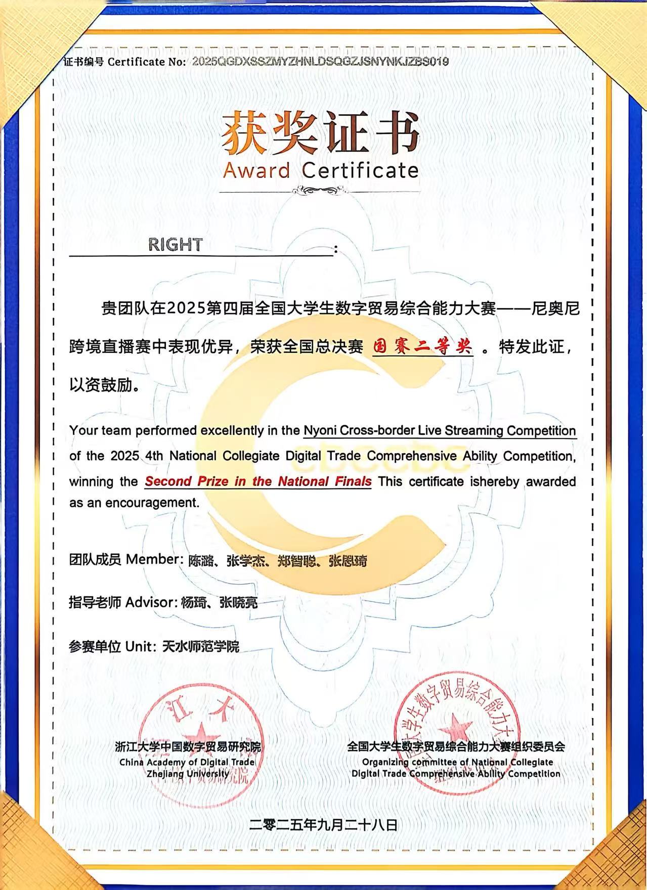 9月28日,2025年第四届全国大学生数字贸易综合能力大赛全国总决赛在浙江大学圆满落幕。该赛事由浙江大学中国数字贸易研究院主办,旨在推动外贸新业态新模式发展,促进产学研用融合,培养数字贸易创新人才,吸引了浙江大学、西安交通大学、中南财经政法大学、辽宁大学、四川外国语大学、浙江正规滚球app平台官网等众多高校的广泛参与。由滚球app官网商务英语专业陈潞、张思琦、郑智聪、张学杰四位同学组成的 RIGHT代表队,在专业老师的悉心指导下,凭借扎实的专业知识、出色的数字贸易实践能力与默契的团队协作,从全国78支参赛队伍中脱颖而出,最终荣获本次比赛跨境直播赛道全国二等奖,充分展现了滚球app官网学子在数字贸易与跨学科融合领域的竞争实力。