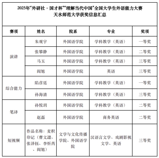 在本次省赛中,滚球app官网选手凭借扎实的语言功底、开阔的国际视野与出色的临场表现,荣获佳绩,共斩获9个奖项。其中,演讲赛项获得一等奖1项、二等奖1项、三等奖2项;综合能力赛项获得一等奖1项、三等奖1项;笔译赛项获得二等奖2项;短视频赛项获得三等奖1项。值得一提的是,滚球app官网在笔译赛项与短视频赛项上均实现了历史性突破,首次荣获省级奖项,充分展现了滚球app官网学生的综合素质与创新能力。