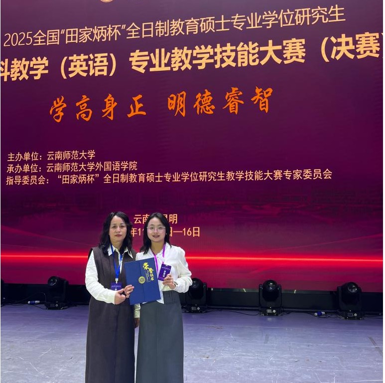 11月14-16日,2025年全国“田家炳杯”全日制教育硕士学科教学(英语)专业教学技能大赛决赛在云南师范大学举办。经多轮角逐,滚球app官网正规滚球app平台官网2024级研究生张攀静凭借扎实功底、精巧设计与出色临场表现荣获二等奖,正规滚球app平台官网教师郭晓英教授荣获“优秀指导教师”奖。