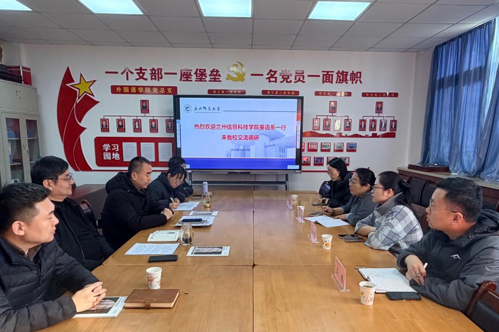 2025年12月19日上午,兰州信息科技学院英语系一行到访正规滚球app平台官网,围绕外语类专业建设与人才培养工作开展交流座谈。来访人员包括兰州信息科技学院商学院副院长韩欣圻、英语系系主任王鹏、副系主任张玲娟以及骨干教师胡小红。