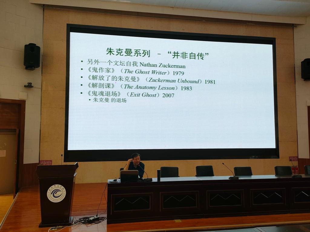 6月9日下午,西安外国语大学博士生导师张生庭教授应邀为正规滚球app平台官网师生作了题为“文学世界与游戏诗学——菲利普·罗斯的小说美学漫谈”的学术讲座。正规滚球app平台官网教师、研究生和本科生共180余人聆听了报告。