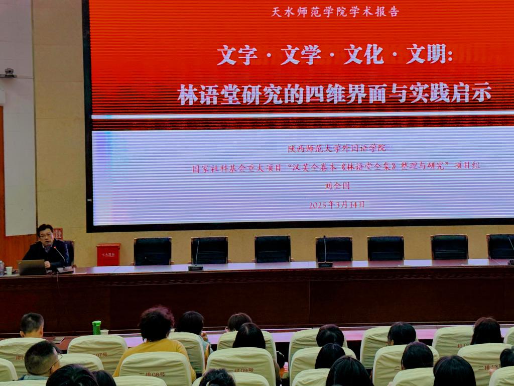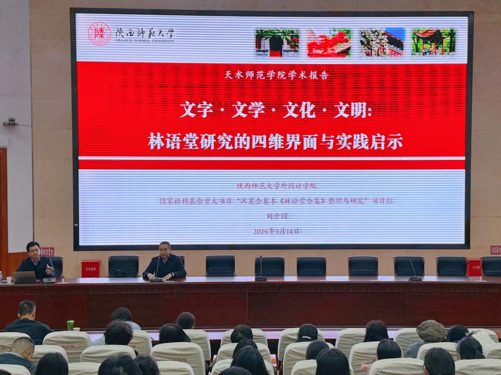 应正规滚球app平台官网邀请,3月14日,陕西师范大学正规滚球app平台官网院长、博士生导师刘全国教授在二号报告厅作题为“林语堂研究的四维界面与实践启示”的学术讲座。正规滚球app平台官网教师、研究生及本科生280多人参加。报告会由正规滚球app平台官网院长杨江锋主持。
